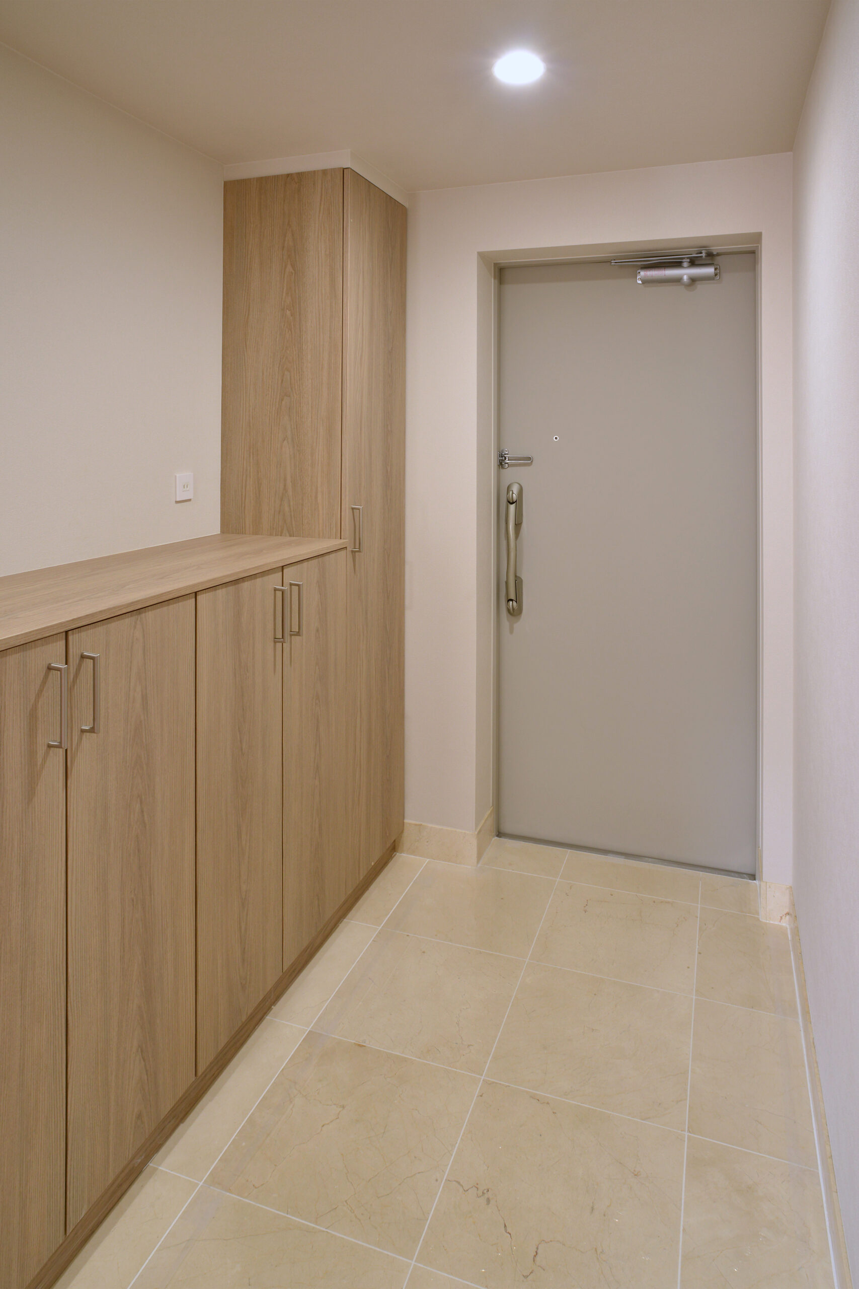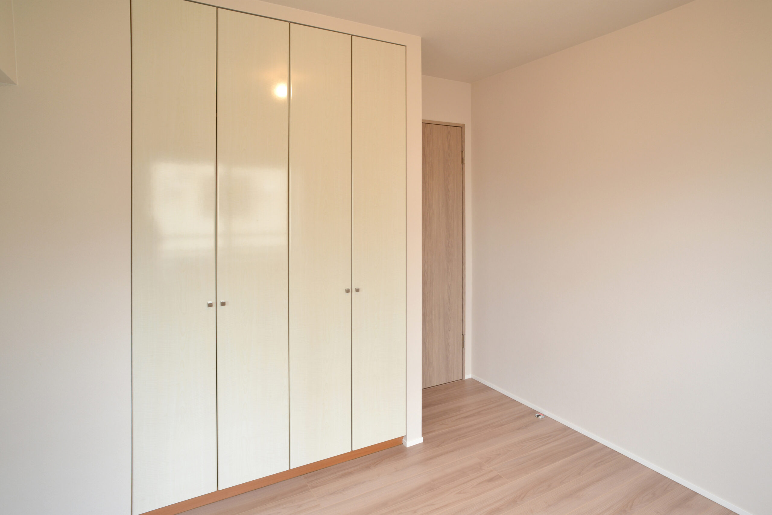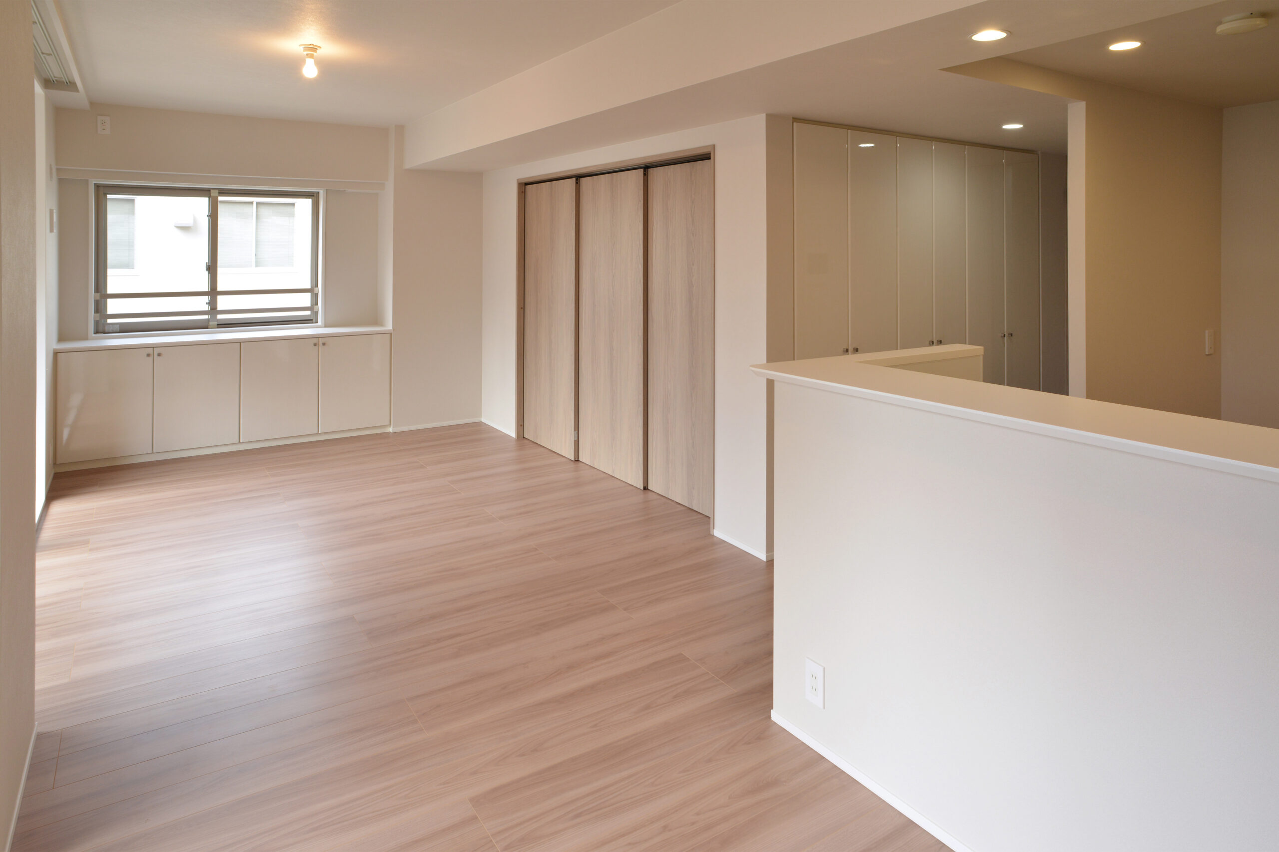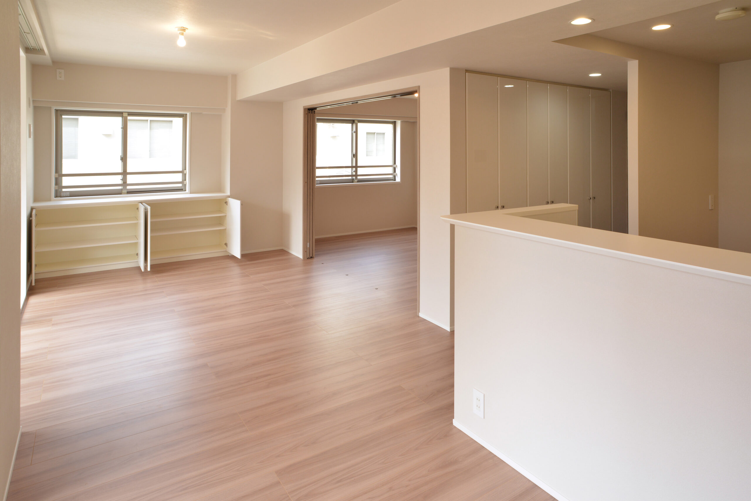 特 徴 不動産会社様より、販売用不動産のリフォーム工事をご依頼いただきました。 既存のキッチンは壁を撤去し、リビングと一体感のある開放的な空間へと一新。家族のコミュニケーションが自然に生まれる、明るく伸びやかなLDKを演出しています。 また、洋間とリビングの間には三枚建ての大型収納扉を設置。扉の開閉によって、広々とした一体空間として使うことも、勉強部屋やリモートワーク用の個室として使うことも可能な、暮らしに合わせて形を変えられる間取りとしました。 内装のカラースキームは、穏やかなニレ材をイメージした色味で統一。主張しすぎない自然なトーンが、豊かで美しい住空間をつくり出しています。
